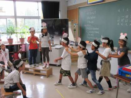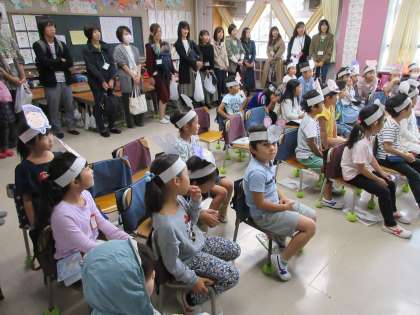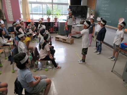 「おおきなかぶ」の発表会が、1年生の別のクラスで行われています。教室にはたくさんのお客様! 子どもたちは大ハッスルです。