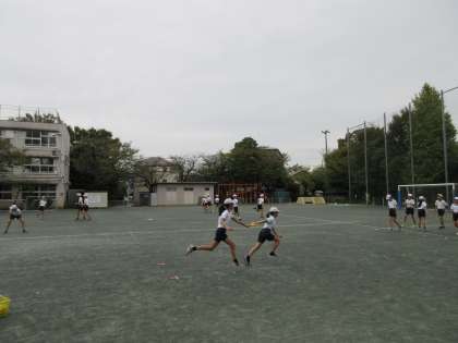 テイクオーバーゾーン内でバトンを受け渡すことを主眼に置いた指導を行っています。全力で走っているから、うっかりするとゾーンからオーバーしてしまいそうな勢いでした。