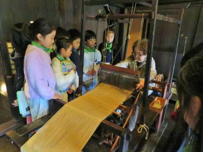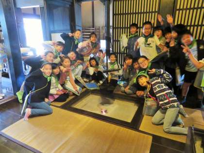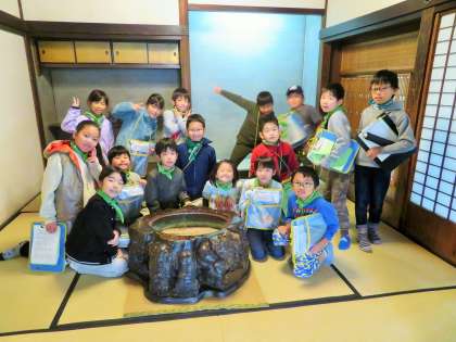 民家園では囲炉裏に火がたかれていて、囲炉裏の暖かさや独特のにおいを肌で感じながら、当時の暮らしぶりを知ることができました。囲炉裏を囲み、昔の道具や生活について話を聞くことを通して、より深く学ぶことができました。