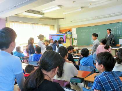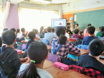 5・6年生は、新学習指導要領を先行実施して、年間70時間の英語に取り組んでいます。今朝は15分間のモジュール学習で、映像を見ながら楽しそうにアルファベットを発音していました。