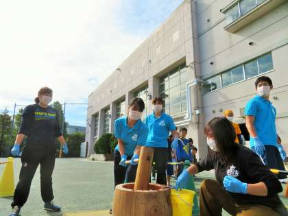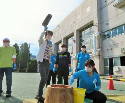 松パパクラブの方々、そして先生たちも「よいしょ!よいしょ!」と、もちつきを始めました。