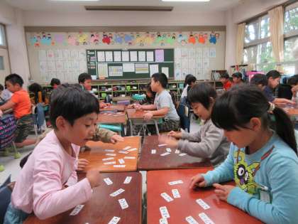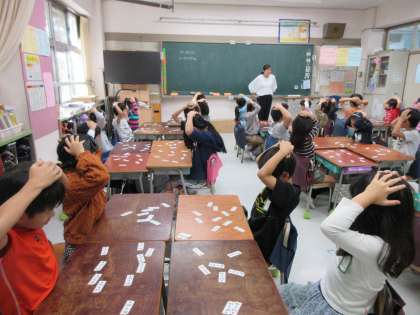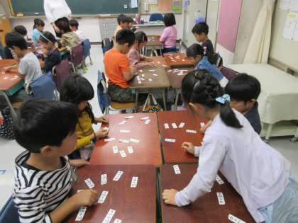 「一桁+一桁」の式が書かれたカードが、机上に散らばって置かれています。先生が式の答えを言ったら、その答えになる式のカードをすばやく取るというゲーム形式で、習熟を図っています。