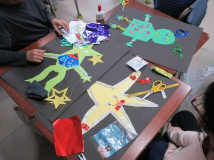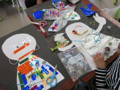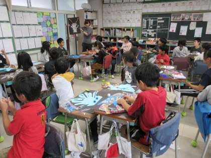 教室がキラキラのオーラを放っています。制作中の机上に目をやると、素材を工夫して仕上げつつある作品の数々が、実に華やかな彩りを見せています。図工「キラキラ星人」に取り組む3年生でした。