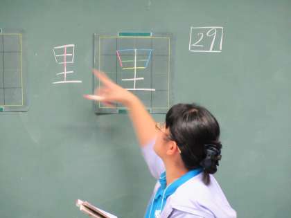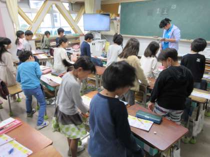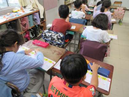 新出漢字「里」を練習している2年生です。初めて出会った文字ですが、既に習っている「田」と「土」が上下で組み合わさっているように見えるではありませんか。しかし、書き順においては、「田」と「土」をそれぞれ独立させて書いてしまうと、おかしなことになってしまいますね。その注意点を丁寧におさえた上で、空書きや頭ふりふり書きで筆順を定着させていました。