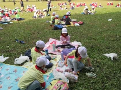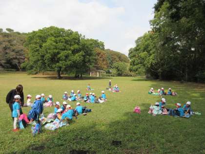 秋さがし前から「お腹がすきました」と言っていた子もいたので、この時間の訪れは最高に嬉しかったことでしょう。グループ毎に、シート広げ、声を揃えて「いただきます!」