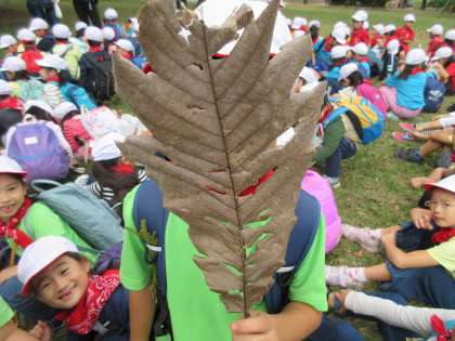 こんなに大きな葉を見付けた子もいました。顔がすっぽり隠れてしまう特大サイズです。
