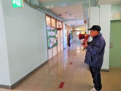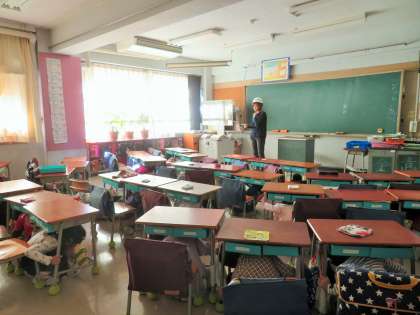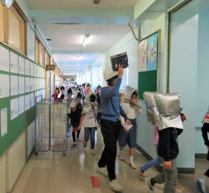 今日は11月の避難訓練で、放送機器が使えないことを想定しての訓練です。放送機器の代わりに学校主事が大きな声で「訓練です。火事です。主事室から出火。避難してください。」と、廊下を走って知らせました。