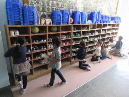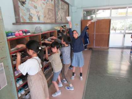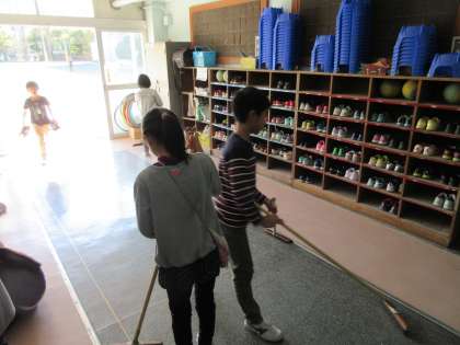 昇降口の靴箱周辺の掃除に精を出す子どもたちです。「あそべくつ」の「そ」と「くつ」に関連しています。