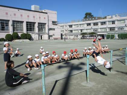 校庭でも、体育館でも、4年生が躍動しています。ハードル走、鉄棒、鬼遊び、いずれの活動においても、教室とはまた違う子どもたちのいきいきとした表情が、授業会場一面に花開いているようでした。