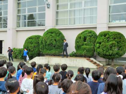 今日の全校朝会では、10月31日に開催された、6年生の世田谷区立小学校連合運動会の話をしました。個人競技では、一人ひとりの真剣さが見られました。リレー競技では、松丘小学校の心が一つになっていて感動しました。