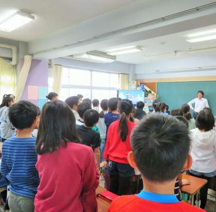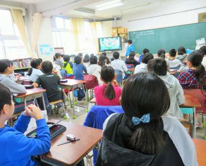 5・6年生は、新学習指導要領を先行実施して、年間70時間の英語に取り組んでいます。今朝は15分間のモジュール学習で、映像を見ながら楽しそうにアルファベットを発音していました。