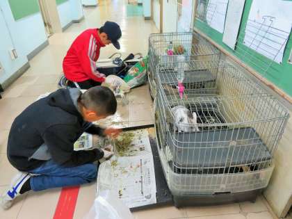 始業前の7時50分、飼育委員の子どもたちは、ウサギのお世話をしてくれています。ウサギ小屋の掃除をはじめ、干し草とウサギの餌、新しい水を与えています。最後に、ウサギの健康状態も記録して引き継いでいます。