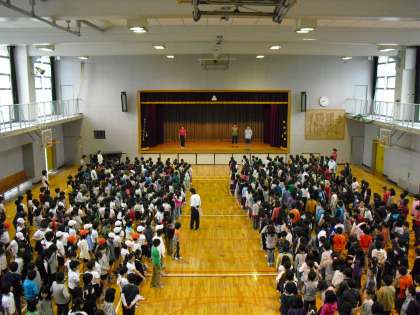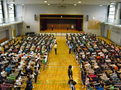 体育館で整列や行進の仕方など団体行動を習い、練習しました。