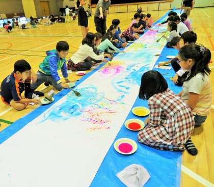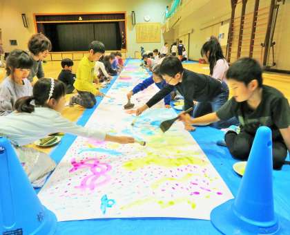 先生が用意したのは、25mの和紙です。そこに、子どもたちは空をイメージして、虹や雨や風や夕暮れなど、様々な空を描いていきました。