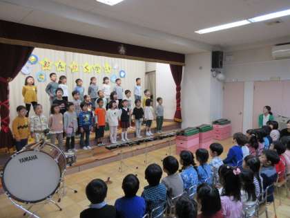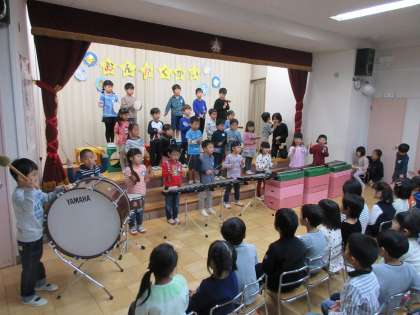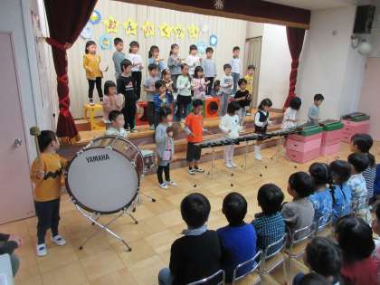 画像は順に、きく組の合奏「夢をかなえてドラえもん」、歌「かぜもゆきもともだちだ」、ゆり組の合奏「勇気100%」の様子です。
