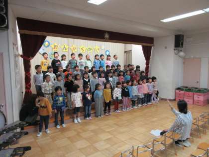 画像はゆり組の歌「12月だもん」、きく組とゆり組の歌「こどものせかい」、「おわりのことば」の様子です。