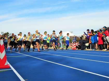 写真は、スタート、1区の様子です。緑のハチマキが「優郷の学び舎」チームです。
