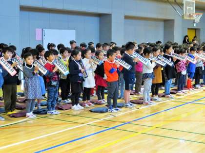 「よろこびのうた」の合奏は、1学期後半からはじめた鍵盤ハーモニカで、堂々と演奏していました。打楽器も印象的でした!