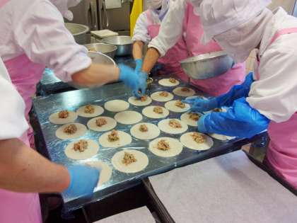大きさや厚さに気をつけながら、調理員さんが一つ一つ丁寧に包んでいます。