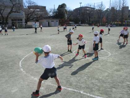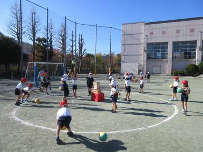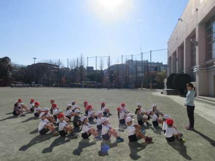 暖かな、よいお天気になりました。校庭では、ポカポカとした日ざしの下、1年生が体育の授業です。