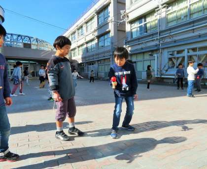 今日は2年生が、教科「日本語」の学習で昔遊びをして盛り上がりました。羽子板、けん玉、コマ回しなどをして楽しそうに遊んでいました。何とも言えないお正月の雰囲気でした。