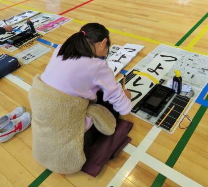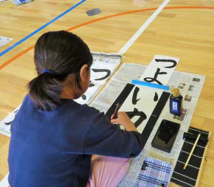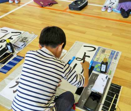 「つよい力」という字のバランスを考えて、真剣に書いています。