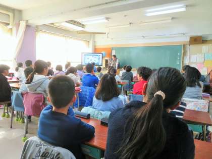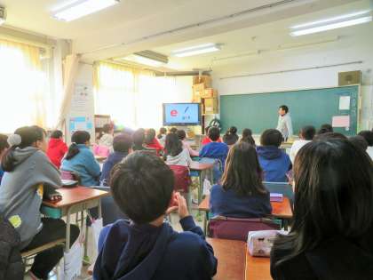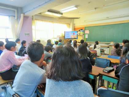 5・6年生は、新学習指導要領を先行実施して、年間70時間の英語に取り組んでいます。今朝は15分間のモジュール学習で、映像を見ながら楽しそうにアルファベットを発音していました。