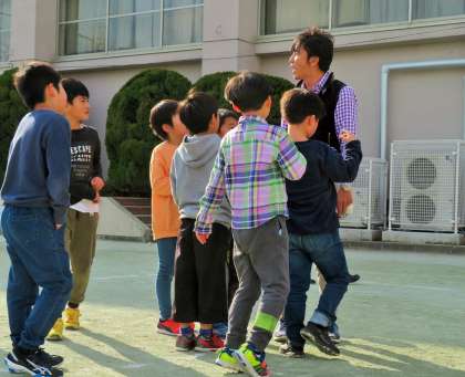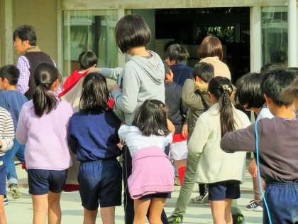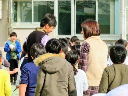 休み時間が終わり、教室に戻る際にも先生の周りには子どもたちが群がっています。