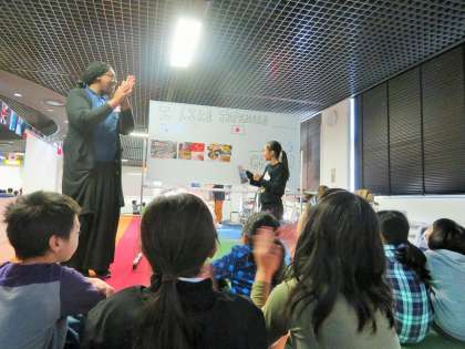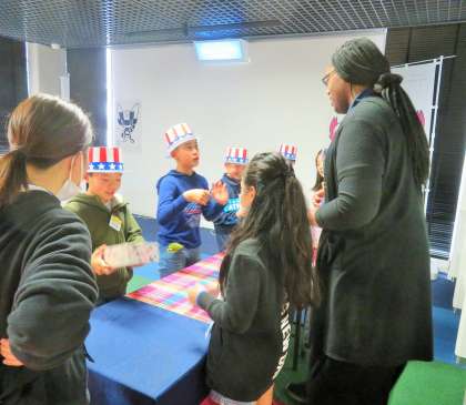 「コミュニケーション」のコーナーでは、来日した外国人のおもてなしや海外での買い物等のバーチャルを体験しながら、英語でコミュニケーションしました。