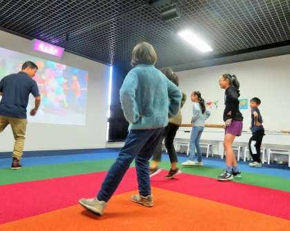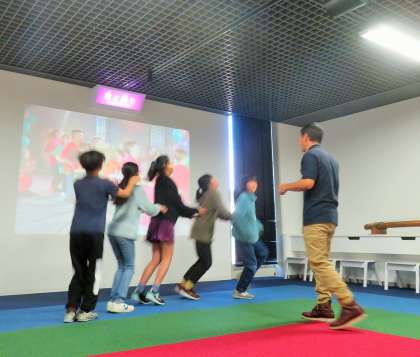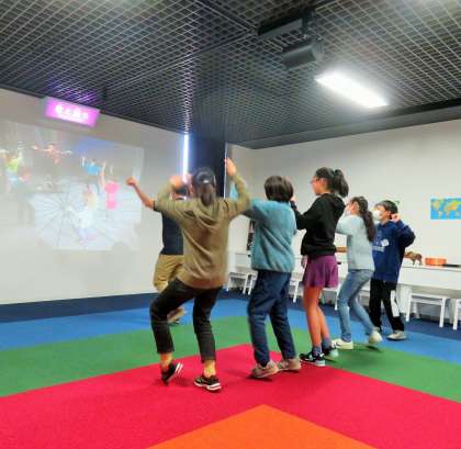 「異文化の歌と踊り」のコーナーでは、英語の歌を歌ったり、海外の音楽に合わせてダンスを踊ったりして異文化を体験しました。このコーナーには、英語活動でお世話になったキー先生がいたので、子どもたちは大喜びです!