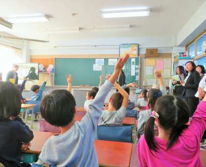 子どもたちが張り切って意見を発表していました。また、友達の意見を聞いたり、自分の考えをワークシートに書いたりしながら、一生懸命考える姿が見られました。