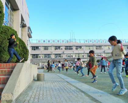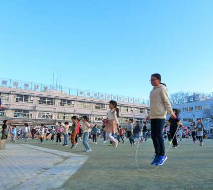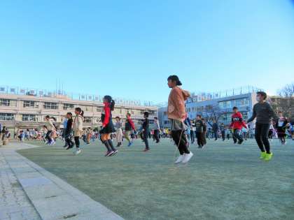 今日の体育朝会は、2・4・6年生の短縄朝会です。先生をお手本に「リズム縄跳び」に取り組みました。基本的な前とび、後ろとび、駆け足とび、交差とびなど、様々な跳び方を織り交ぜて跳んでいます。