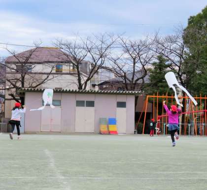 今日は凧揚げをしました。空高く揚げた凧は、世界に一つだけのオリジナルの凧です。思い思いに描いた凧は、とてもカラフルでした。