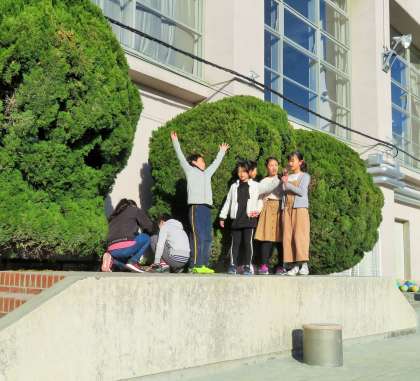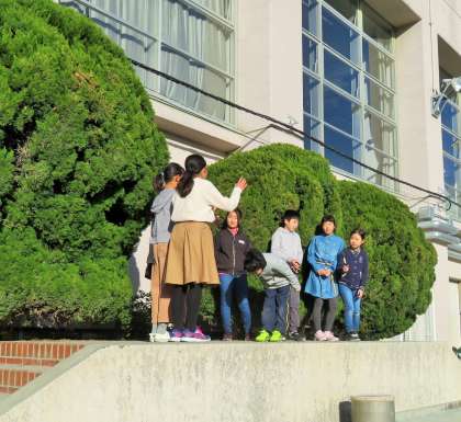 今日の児童集会は、集会委員会による「チョコを取り返せ チョコ次郎大作戦」集会です。二人で協力してボールを運び、クラスでつないでいく集会です。