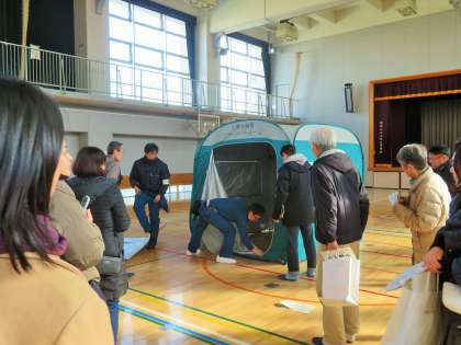今日は防災倉庫の見学、プライベートルームの設置、間仕切りの設置、仮設トイレの設置、受付の設営、防災無線の確認等を実施しました。