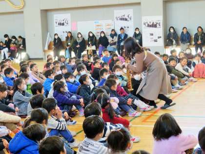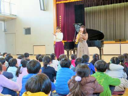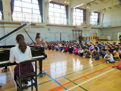 1〜3年生の子どもたちは、体育館でミニ音楽鑑賞会です。「エバリー」の方々をお招きして、子どもたちの前でピアノとソプラノサックスの生演奏を披露していただきました。