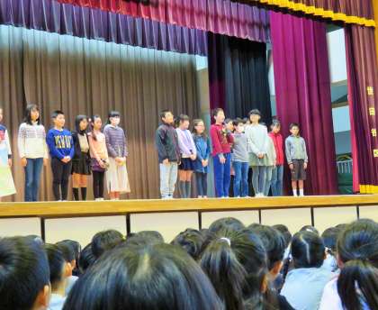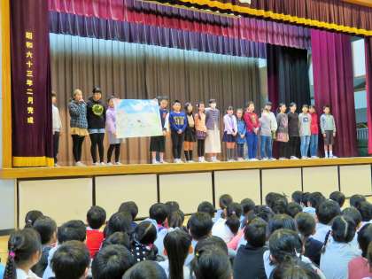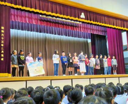 今日の児童集会は、1年間のクラブ活動を発表する集会です。各クラブ、とても上手に活動内容をまとめ、自分たちのクラブのことを発表していました。
