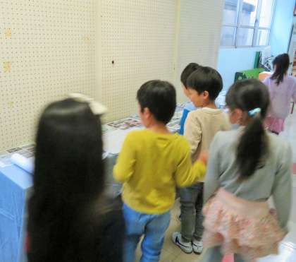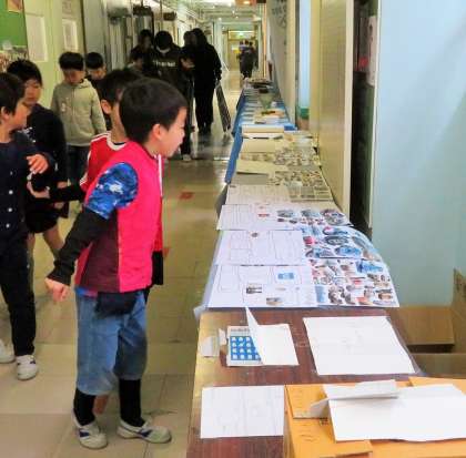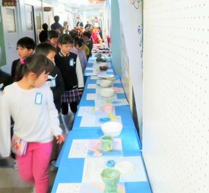 職員室前には作品が展示されています。一生懸命制作した作品です。学校にお出かけの際には是非、お立ち寄りください。