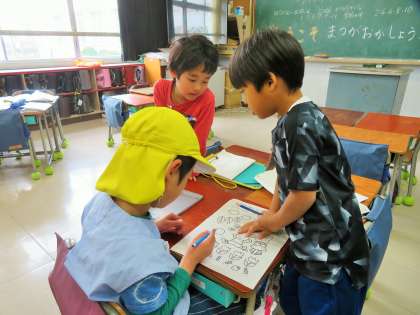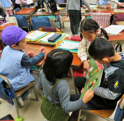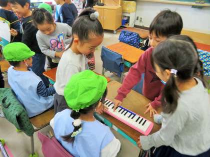 小学校の教室で椅子に座ってもらい、読み聞かせをしたり、鍵盤ハーモニカを教えたりしました。年長組の子どもたちの緊張もほぐれてきました。