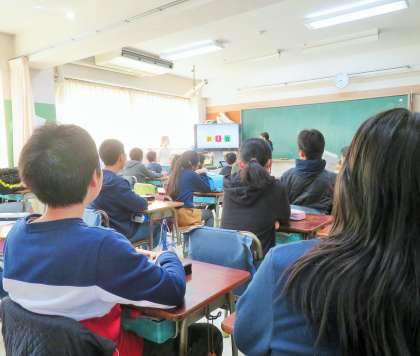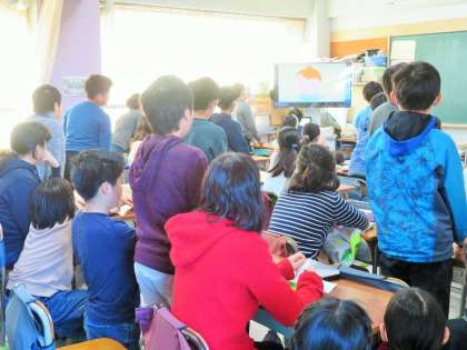 5・6年生は、新学習指導要領を先行実施して、年間70時間の英語に取り組んでいます。今朝は15分間のモジュール学習で、映像を見ながら楽しそうにアルファベットを発音していました。
