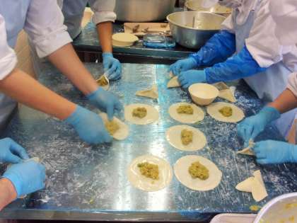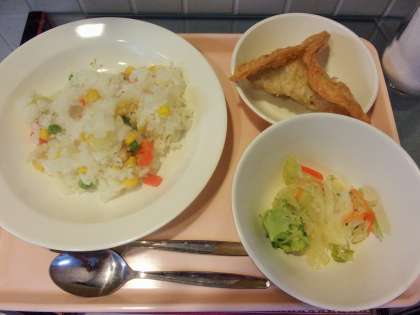 給食では、ぎょうざの皮を使って包んで揚げました。