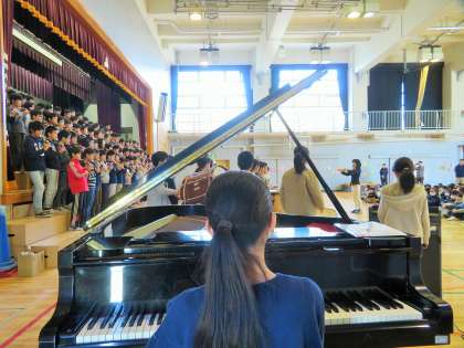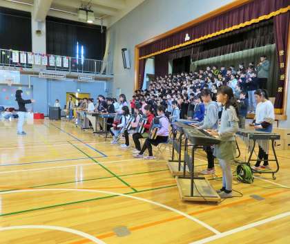今度は、6年生からお礼の合奏「ルパン三世のテーマ」と「旅立ちの日に」の合唱です。