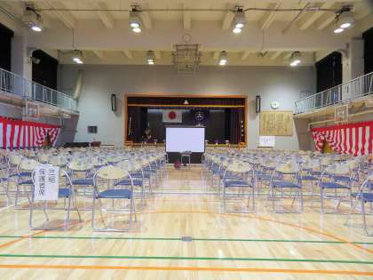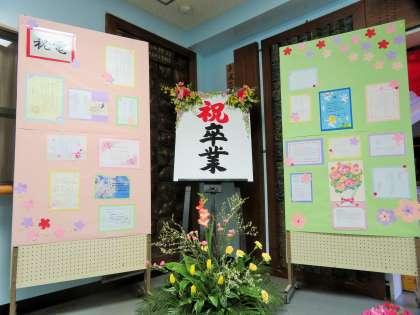 子どもたちの下校後は、教職員が心を込めて会場準備を行いました。このような状況だからこそ、子どもたちの思い出に残る卒業式にしたいと思っています。心温まるお祝いのメッセージボードが体育館入口にあります。