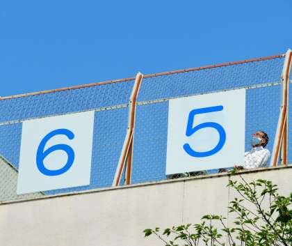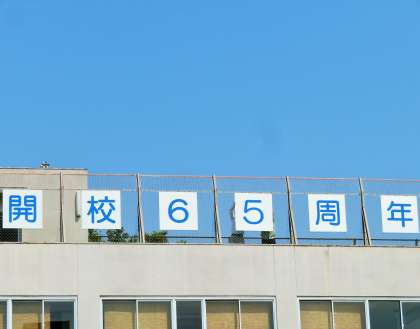 松丘小学校は6月14日の日曜日に、65歳の誕生日を迎えます。校庭から校舎屋上を見上げると、同窓会の会長さんが「65周年」の看板を取り付けてくださっていました。文字が光っています!