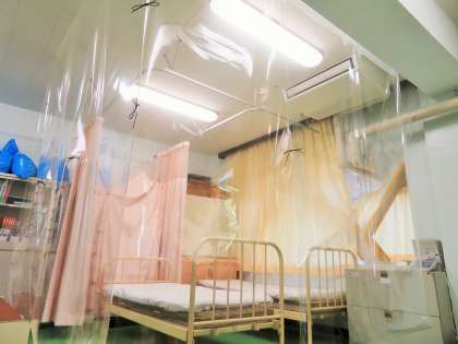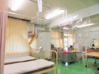 来週からの分散登校に向けて、保健室も「新しい学校生活のスタイル」へと体制を整えています。内科入口と外科入口を分け、内科のベットは、透明のビニールパーテーションで囲っています。さらに衝立を利用して目的別に利用する場所を分けて、保健室内での人と人との接触を避けて感染を防止します。目的ごとに使用場所が誰でもわかりやすいようにしています。非接触型の体温計も4本準備しました。