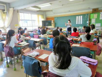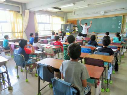 担任の先生が、緊張気味の子どもたちの心を解きほぐすような話をしています。