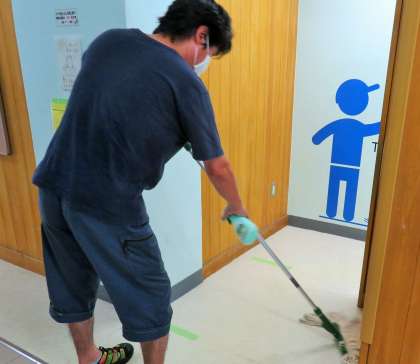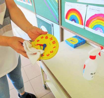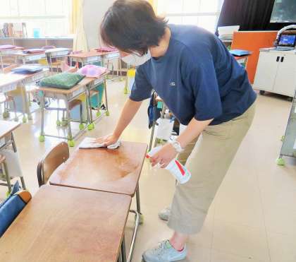 午前の部、子どもたちの下校後には、先生や主事が机、教材、トイレなどの消毒を行っています。