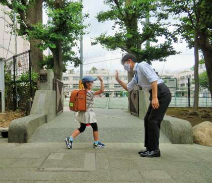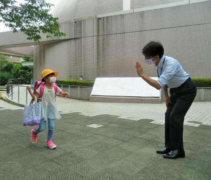 あいさつの声が大きくなってきたので嬉しいです。エアータッチをしながらお迎えです!