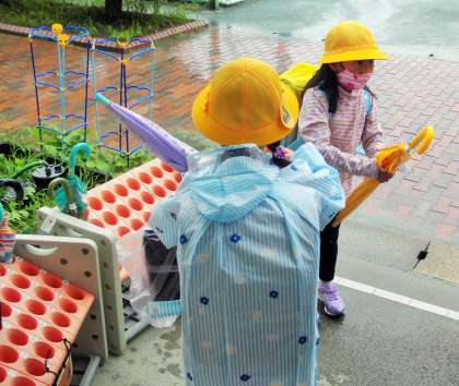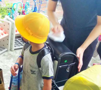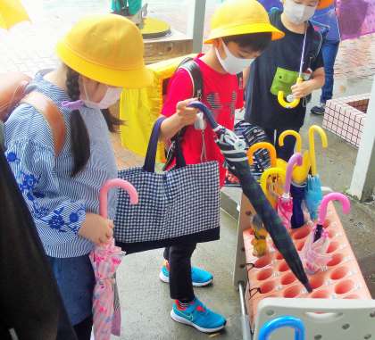 朝の登校時は雨が降っていたので心配をしていました。1年生はしっかりと傘をクルクル丸めて傘立てに入れたり、カッパをたたんだりと、自分でやろうとがんばっていました。