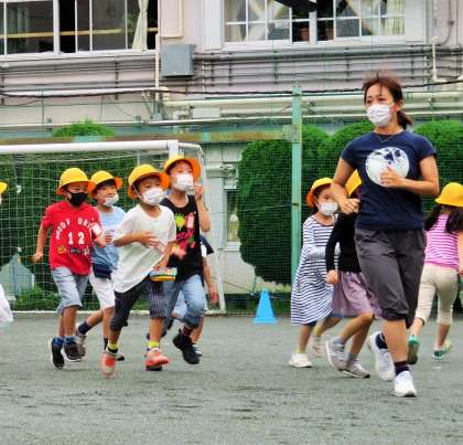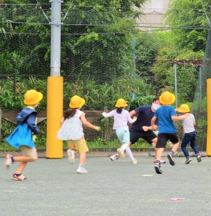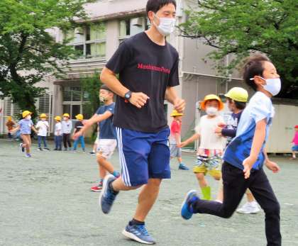 始業前の朝遊びをすることで、健康・体力の向上ばかりでなく、脳が活性化され授業での集中力もアップします。先生も一緒に遊んでいます!